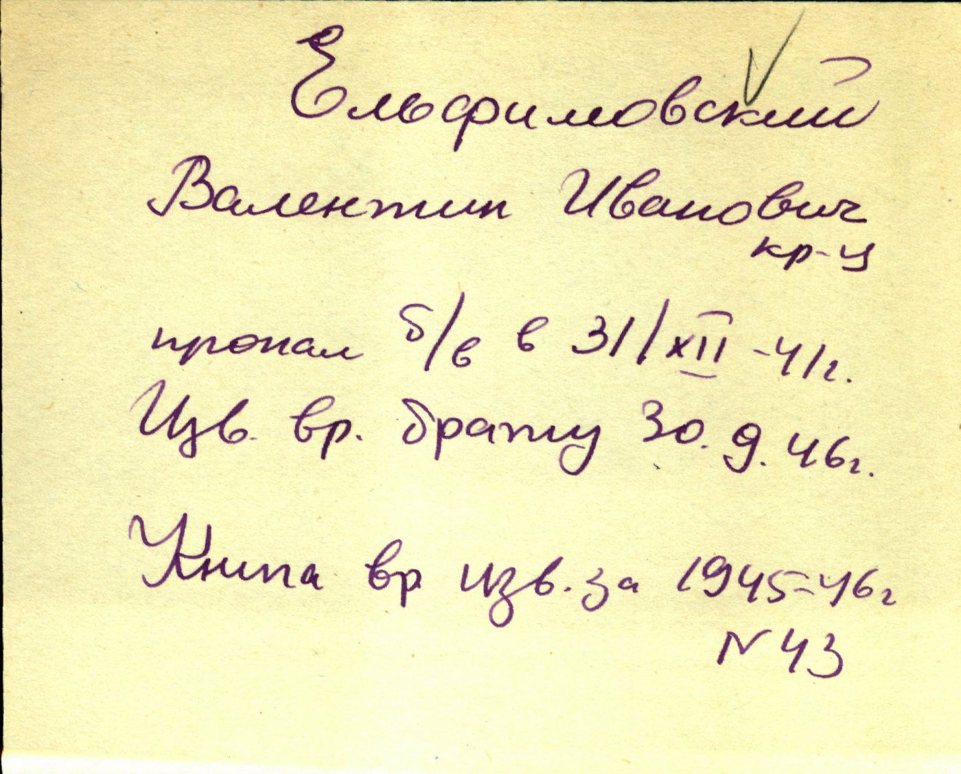 Друг-односельчанин, с которым Анатолий Овсянкин ушел на фронт, Валентин Иванович Ельфимовский пропал без вести.