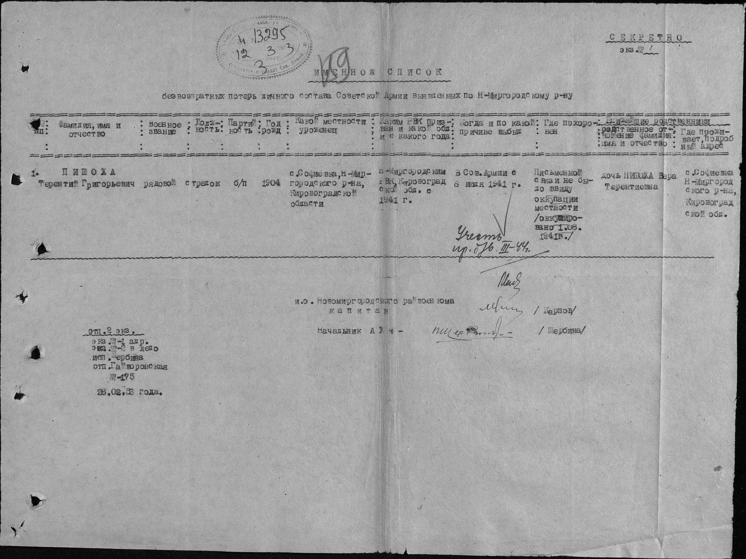 Пишоха Терентий Григорьевич, 1904 г.р., с. Софиевка,Новомиргородского района, Кировоградской области,дочь - Пишоха Вера Терентиевна. Помогите найти место захоронения.