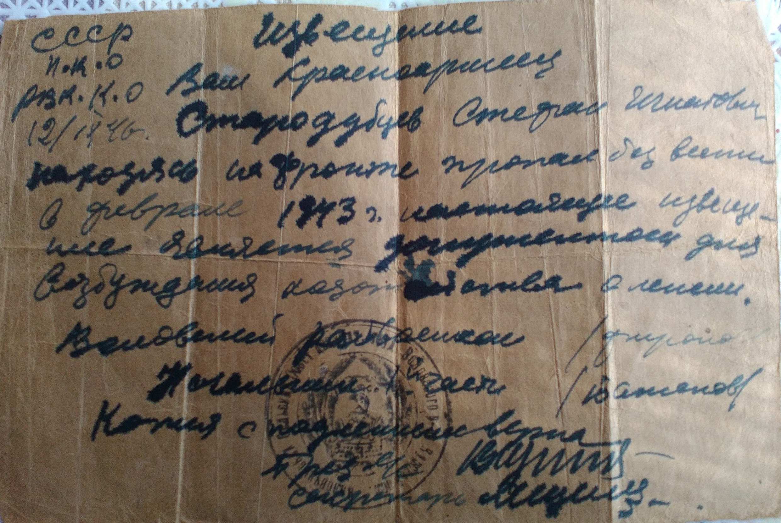 Прошу помощи в установлении судьбы прадеда - Стародубцева Стефана Игнатьевича, 1903 г.р., уроженца Курской обл, Воловского р-на, с.Воловчик. Единственная доступная архивная информация - данные подомового опроса 1946 года: http://obd-memorial.ru/html/info.htm?id=57428591. |