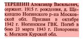 | Ищу информацию о своем дяде Терешине Александре Васильевиче 1915 года рождения д.Щекавцево Московской обл Ногинского района воевал на Финской войне, в ВОВ был танкистом,воевал под Курском,погиб смертью храбрых в 1943 году,похоронен х Малиновский Курской обл, к сожелению нет никаких документов |