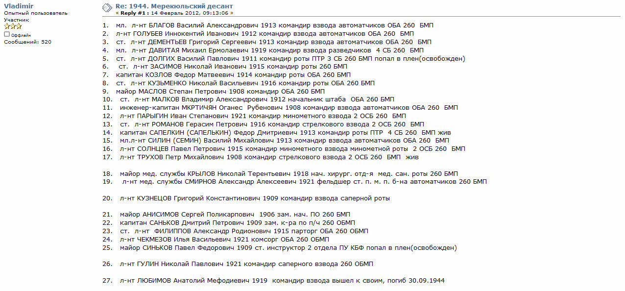 Здравствуйте! Ищу список участников Мерекюльского десанта 14.02.1944г. В книге В.И.Гринкевича "Разве можно забыть Мерекюла?" 1979г. упоминаются всего около 100 фамилий из 517 десантников 260-й отдельной бригады морской пехоты. Гусев Михаил Александрович |