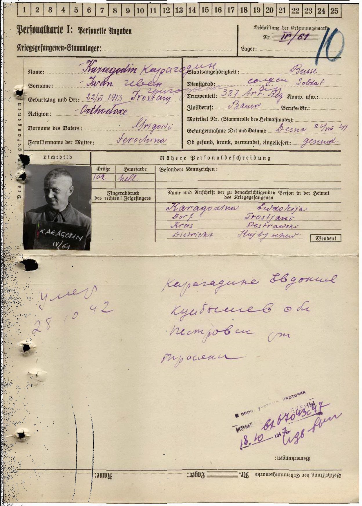 | Пожалуйста, помогите найти информацию о захоронении прадеда - Карагодина Ивана Григорьевича, дата рождения: 22.06.1913, с.Тростянь, Пестравского района, Куйбышевской области. Служил в 13-й армии в составе 387 гаубично-артиллерийского полка. Был пленен 25-26 августа 1941 на Десне, предположительно в районе города Новгород-Северский. По информации ОБД "Мемориал" умер 28.10.1942. но информацию о содержании в шталаге или о месте захоронения нигде не удается найти. |