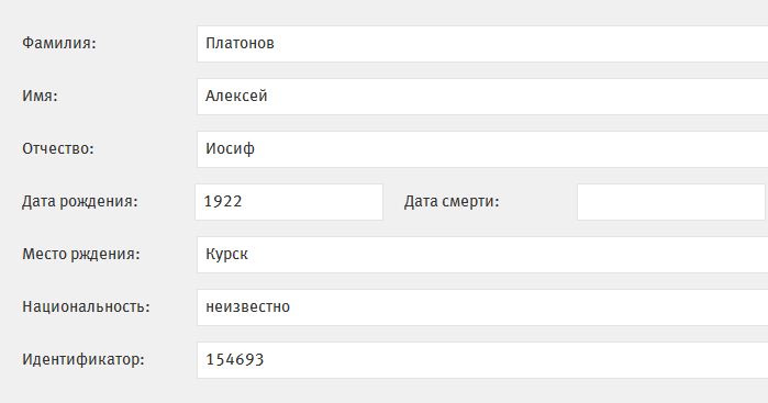 Платонов Алексей Иосифович 16августа 1921 года . Я везде искала и отправляла запросы -ответа нет .В военкомате по месту жительства архив сгорел ,данных нет .На сайте по поиску военнопленных нашла Платонов Алексей Иосифович и идентификационный номер и больше ничего .Возможно он был где-то в плену. Я предполагаю ,что дедушка мог быть призван в армию ,а оттуда сразу на фронт. Подскажите , пожалуйста, где дальше искать .В живых никого не осталось -спросить не у кого.Подскажите ,где искать дальше . Спасибо большое ,что так быстро ответили. |