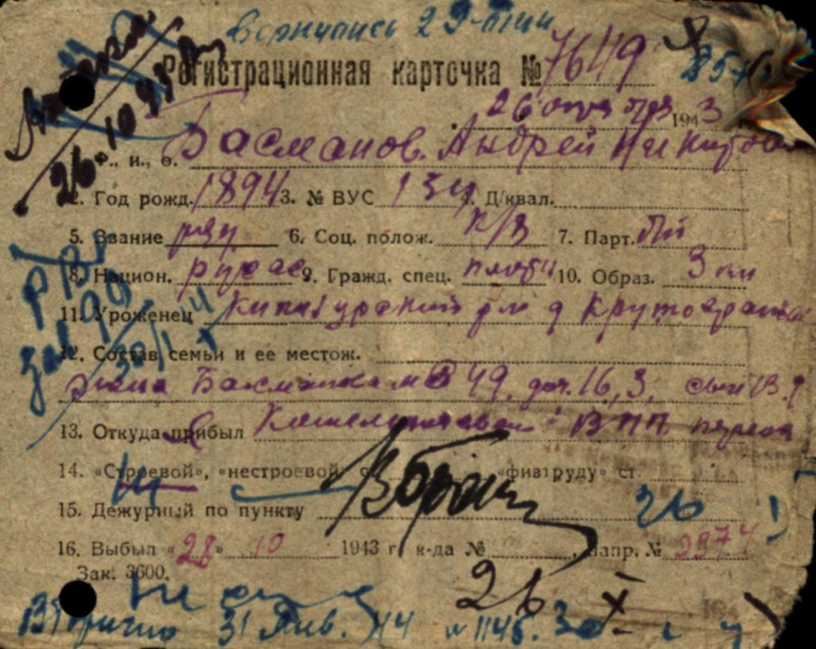 Басманов Андрей Никитьевич родился 1 сентября(какого года не известно)в деревне Крутовражье Кикнурского района Кировской области. Умер 31 марта 1944 года в больнице Ивановской области предположительно в Кинешме. Призывался из Кикнурского военкомата Кировской области.Работал на военном заводе(писал в письме что готовим немцам проклятым гостинцы) Письма не сохранились.Жена Басманова Мария Спиридоновна. |