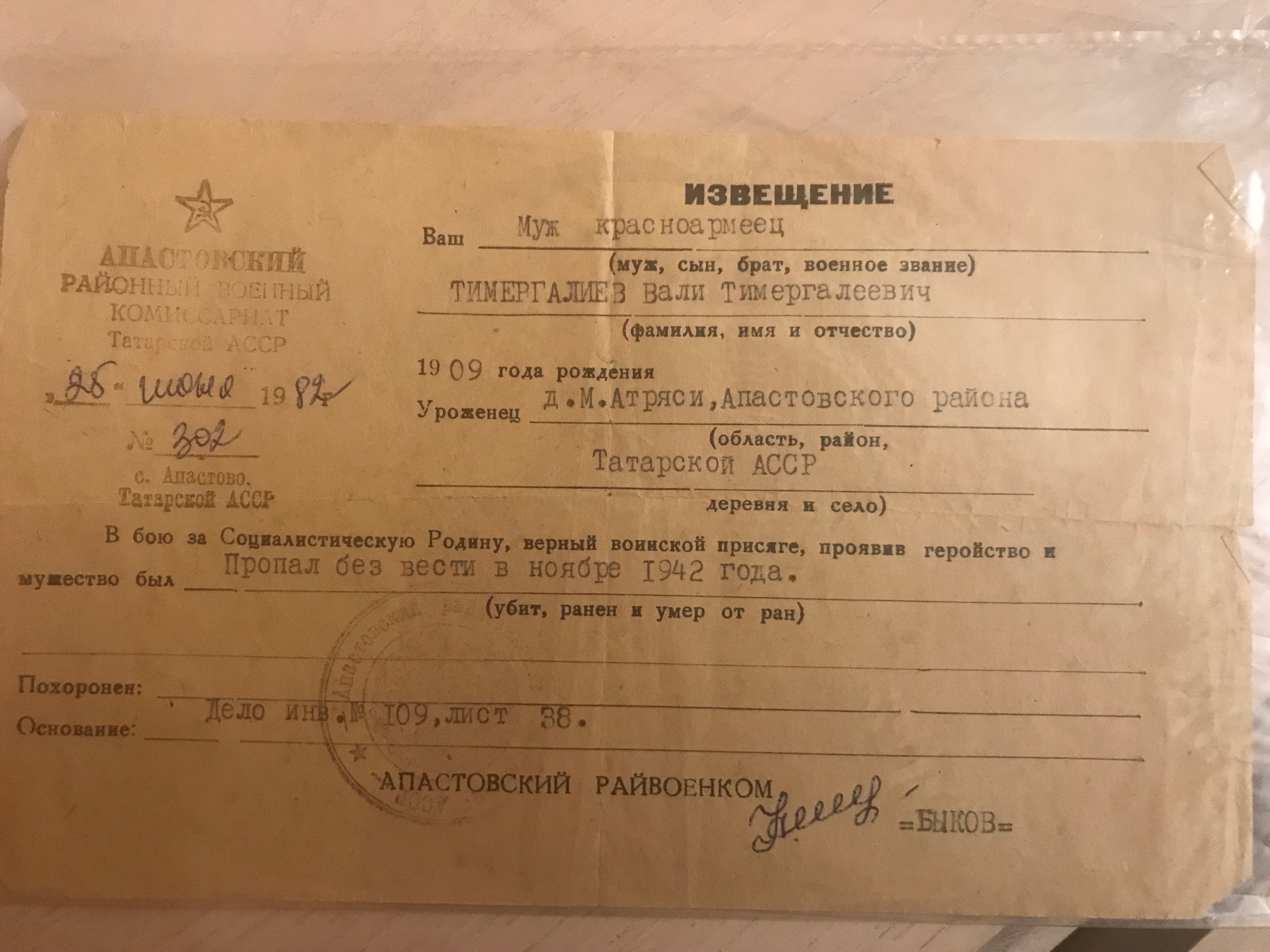 | Добрый день! Пожалуйста, помогите найти информацию о прадеде. Место призыва Татарстан, Апастовский районный военный комиссариат, лето 1941 г. Супруга Тимергалиева (Шамсутдинова) Рахима Сабиржановна (1911 г.р.), имя мамы Сибтиха (возможны ошибки в имени мамы). Место рождения д. Малые Атряси. Было получено только 1 письмо, которое не сохранилось, род войск не знаю. Осталось только извещение. |