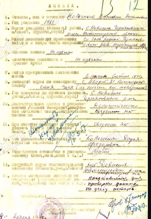 Пожалуйста помогите найти любые сведения о судьбе моего дяди Колесник Василия Антонивича, 1921 года рождения, Место рождения Украинская ССР, Житомирская обл., Черняховский р-н, с. Новополь