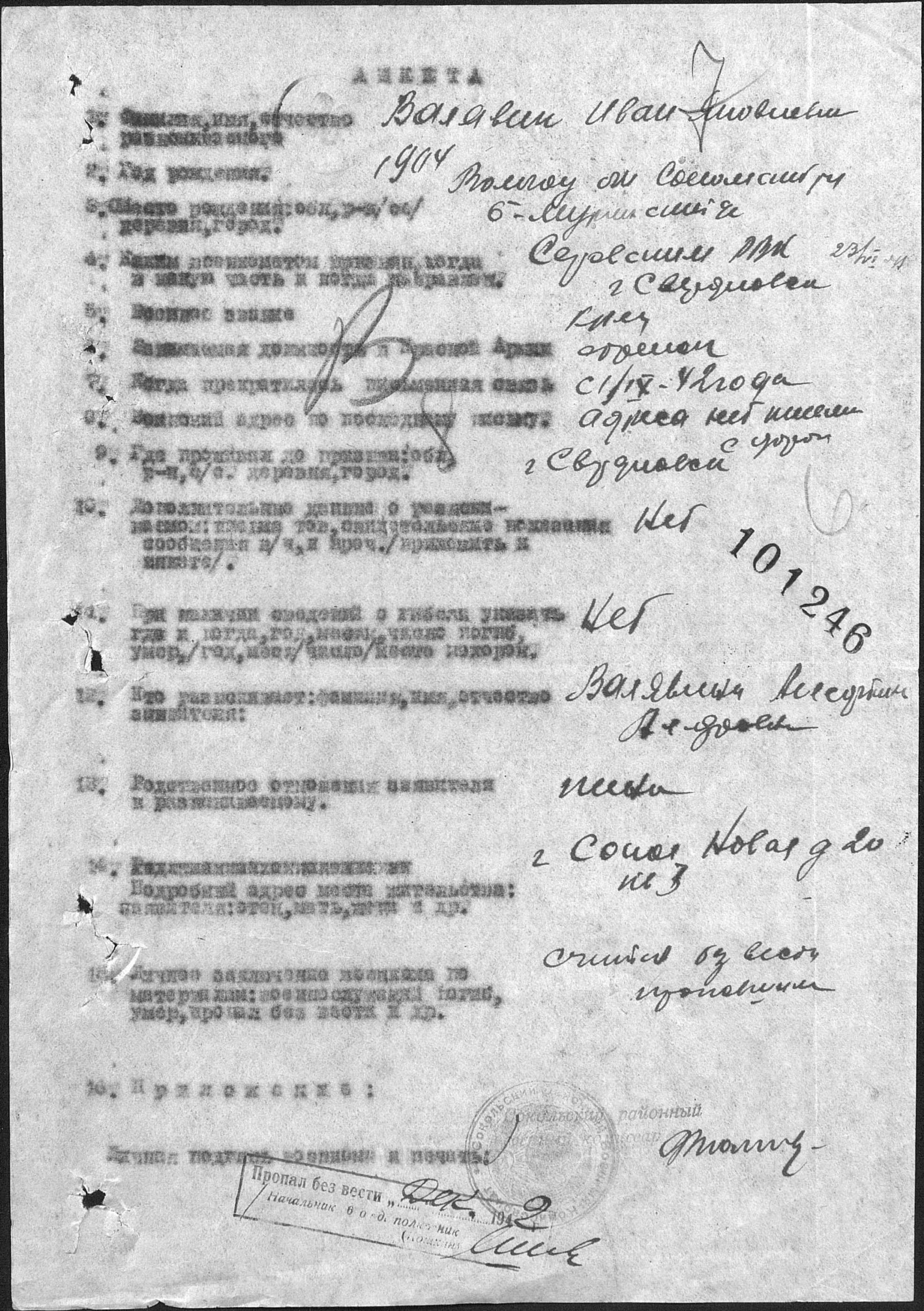 Письменная связь прекратилась с 01.09.1942, в розыск подавала жена Валявина Алефтина Александровна