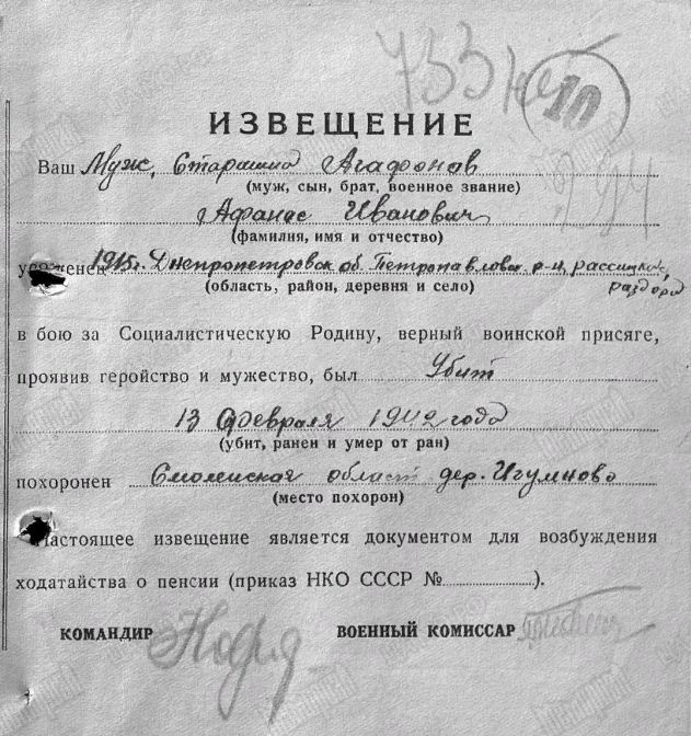 | Агафонов Афанас Иванович!!! Место рождения Днпропетровская область,Петропавловский район,моя мама утверждает что д.или с.Раздоры год рождения в1915-1916г. Заключил брак в Сумской обл.точно не знаю в д.Чернечина или же в г.Ахтырка перед уходом на войну ,жена Агафонова Анна Фёдоровна, мать его звали Мария у него ещё был (брат или сестра)моя мама не помнит его мать умерла где-то в 117 лет когда моя мама и мой дедушка с пробабушкой приезжали к ним в гости ей было где-то около 100 лет , я так понимаю что им она сказала что он пропал без вести и к ней не приезжал.В Петропавловске жила женщина она тоже родила от него сына как зовут не знаю. Мама говорит что ему пришла повестка в Петропавловске он приехал попрощаться в Сумская обл. г.Ахтырка д.Доброславовка с бабушкой и на второй день ушол на войну .Я нашла документы утверждающие потерю в 01.1944г.донесение номер 78087. Призван в 1936г.Петропавловским РВК звание красноармеец причина выбытия пропал без вести , но место рождения Днепропетровская обл.Петропавловский р-н с.Лозовое (Лозова, Лозово)В них как мне показалось в низу подписано Изв.выж.кон.24/|| 42 или 47г.Огромная просьба если есть какая информация поделитесь пожалуйста если это речь идёт про него я так понимаю он был контужен поэтому он выбыл из списка убитых в Сумской обл.Фотография сделана в тот же день когда они расписались. |