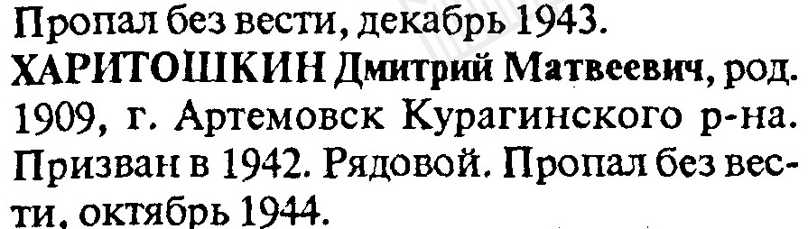 Примерно родом г.Артемовск Красноярского края,пропал без вести октябрь 1941г, жена Харитошина Прасковья Харитоновна