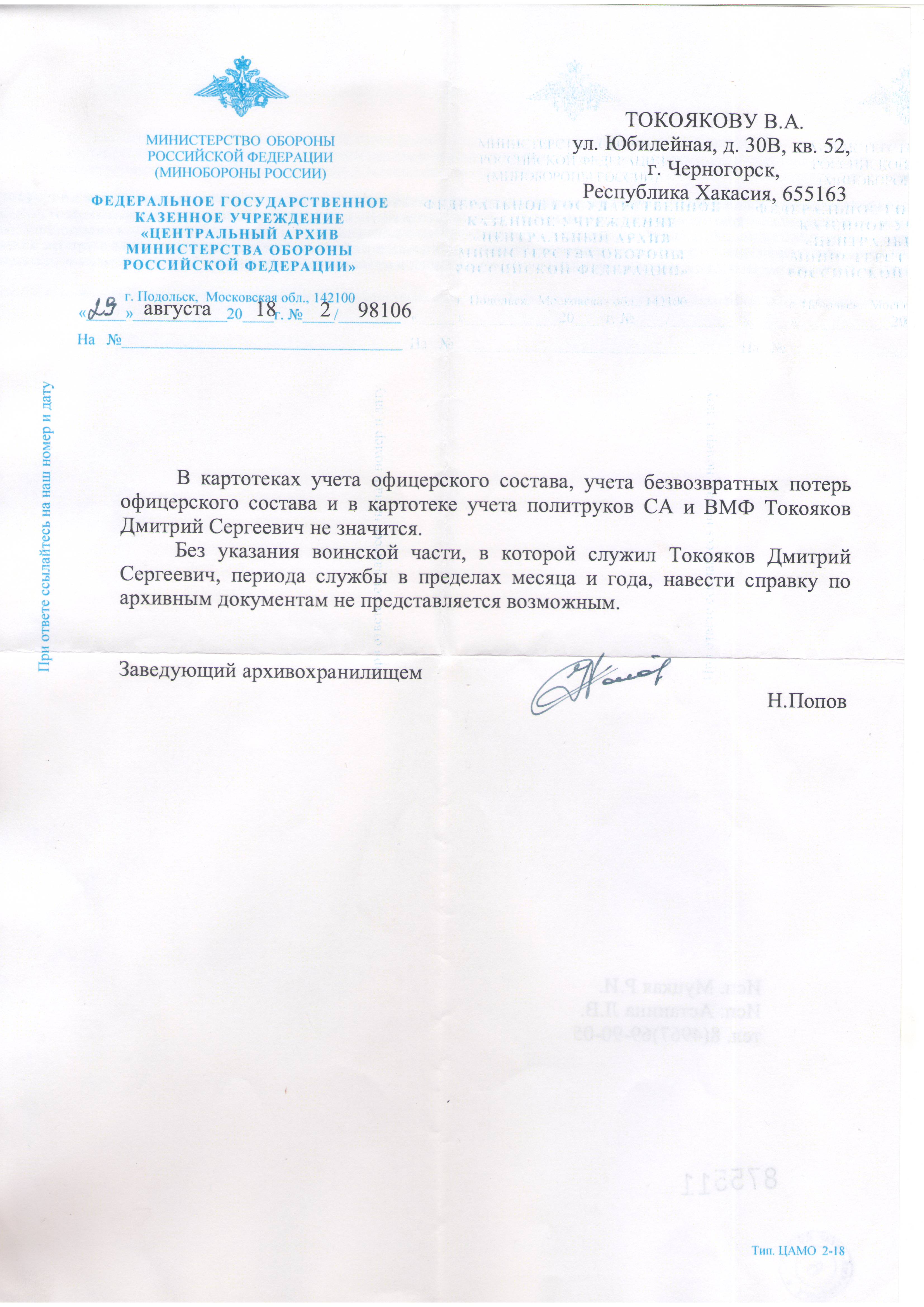 Ищу брата моего деда, Токоякова Ондрея Сергеевича 1914г.р., Токоякова Дмитрия Сергеевича 1916 г.р. ул.Печень Таштыпского района ныне Аскизского района Хакасской Автономной Области. Призван Таштыпским РВК в феврале 1940 г., сержант ,командир отделения. Подготовку проходил в Иркутской Области г.Черемхово. Прекращена связь 3 июля 1941 г. полевая почта № 150. Во время Великой Отечественной войне воевал в Воронежской Области был политруком.Пропал без вести. |