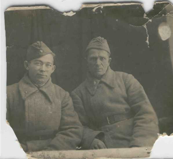 | Никифоров Андрей Егорович 1901 г. рождения, жена Никифорова Софья Николаевна. В 1941 г проживал с семьей в с. Перещипное Неткачевского р-на Сталинградской обл. Призван в августе 1941 г. Неткачевским РВК. Пропал без вести , последнее письмо в мае 1942г. На фото он справа "Худой" Известно, что до войны работал каким-то агентом, ездил по деревням. |