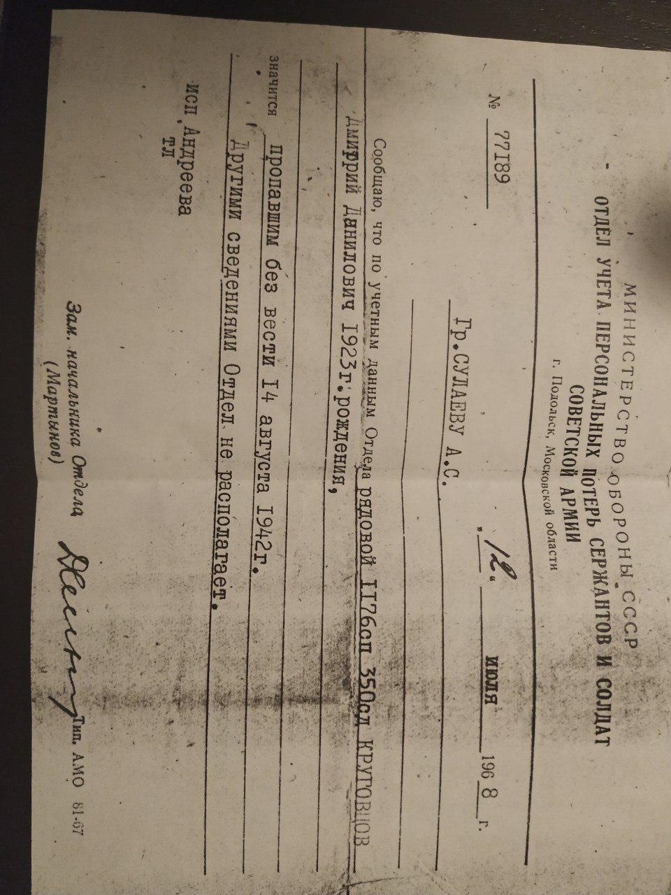 Рядовой 1176сп 350сд Круговцов Дмитрий Данилович значится пропавшим без вести 14 августа 1942г.