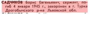 Садчиков Борис Евгеньевич сержант погиб 4 января 1945 года. Других данных не имею