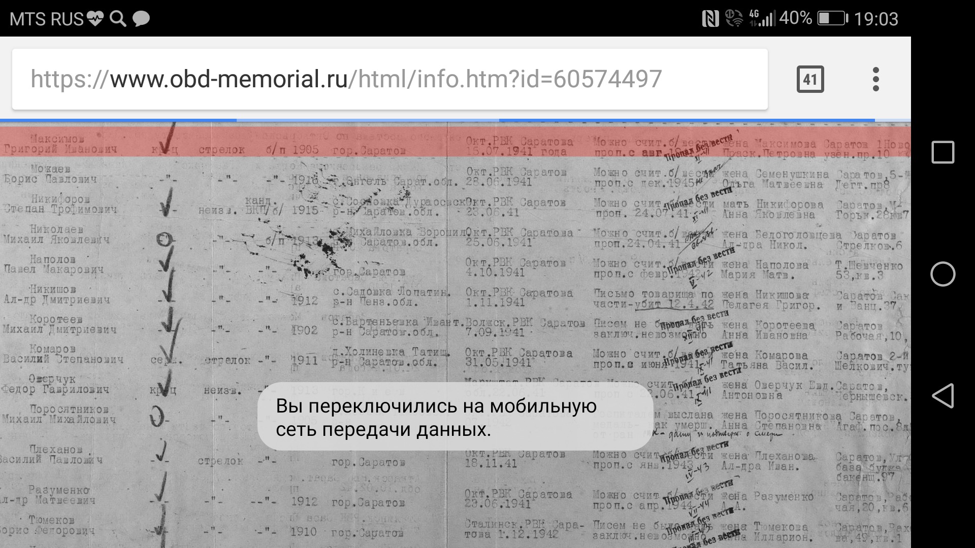 | Максимов Григорий Иванович 1905 г.р. Саратов. Призван 15.07.1941 Октябрьским РВК г. Саратова. Пропал б/в в авг.1941 (по др.дан.в ноябре 41). К-ц стрелок б/п. Жена Максимова Прасковья Петровна, адрес г.Саратов 1-й Новоузенский пр.10. Хотелось бы узнать, где был убит, где похоронен, хоть что-то. Пропал в течение 2 недель с призыва. Помогите информацией. Не могу зарег-ся здесь(( |