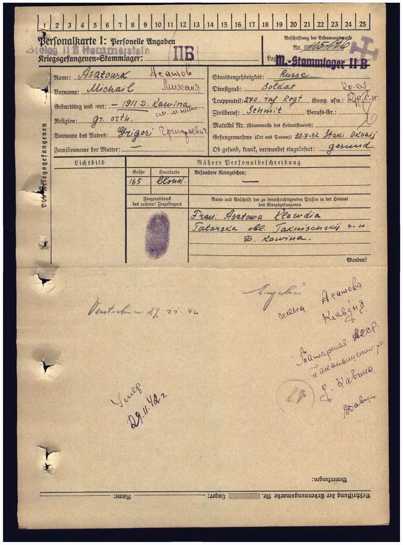 До войны проживал по адресу: Татарская АССР, Таканышский р-н, село Тавели; жена Асафова Клавдия, ПОГИБ В ПЛЕНУ 29.11.1942 года в Норвегии, лагерь Энгелой.