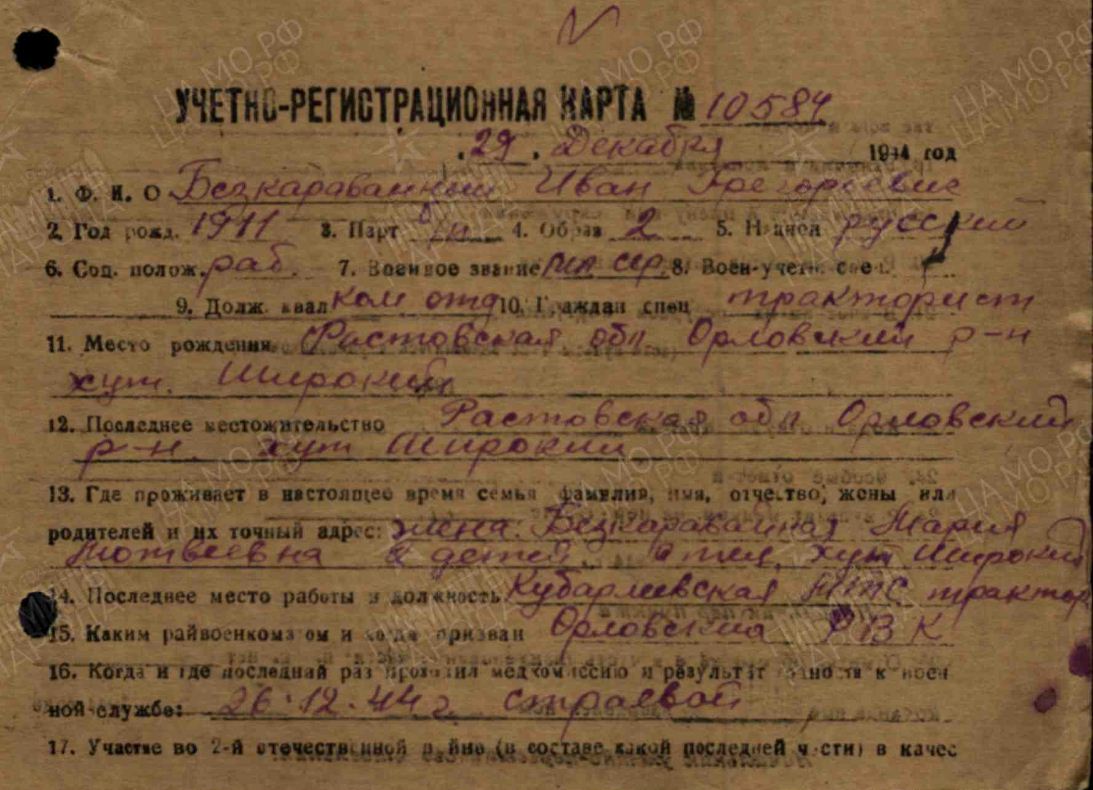 Место призыва: Орловский РВК, Ростовская обл., Орловский р-н