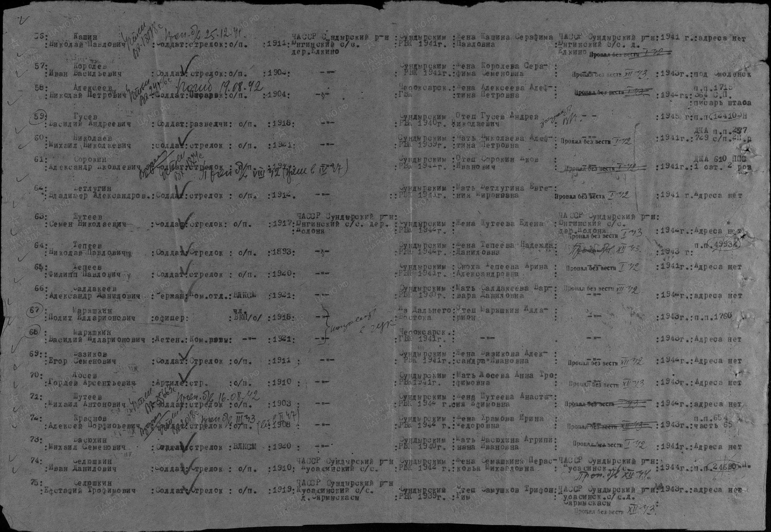 Помогите найти какую-либо информацию: воинское звание сержант, 1921 года рождения, место призыва Сундырский РВК, Чувашская АССР, Сундырский р-н. Пропал без вести в декабре 1942 года