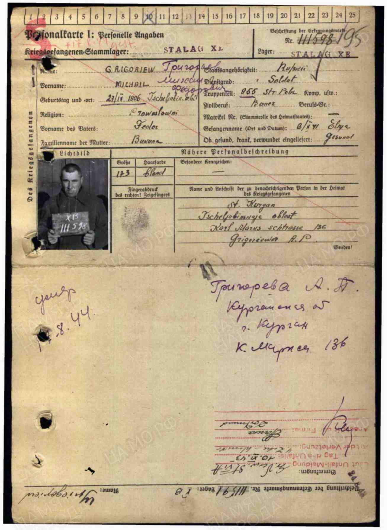 | Мл.сержант, командир отделения, место рождения Курганская область, Курганский р-н, деревня Затобольная.Жена Григорьева Анна Леонидовна. Призван Курганским ГВК в августе 1941г. Место и дата смерти неизвестны. В прикрепленном файле возможно его пленная карта. |