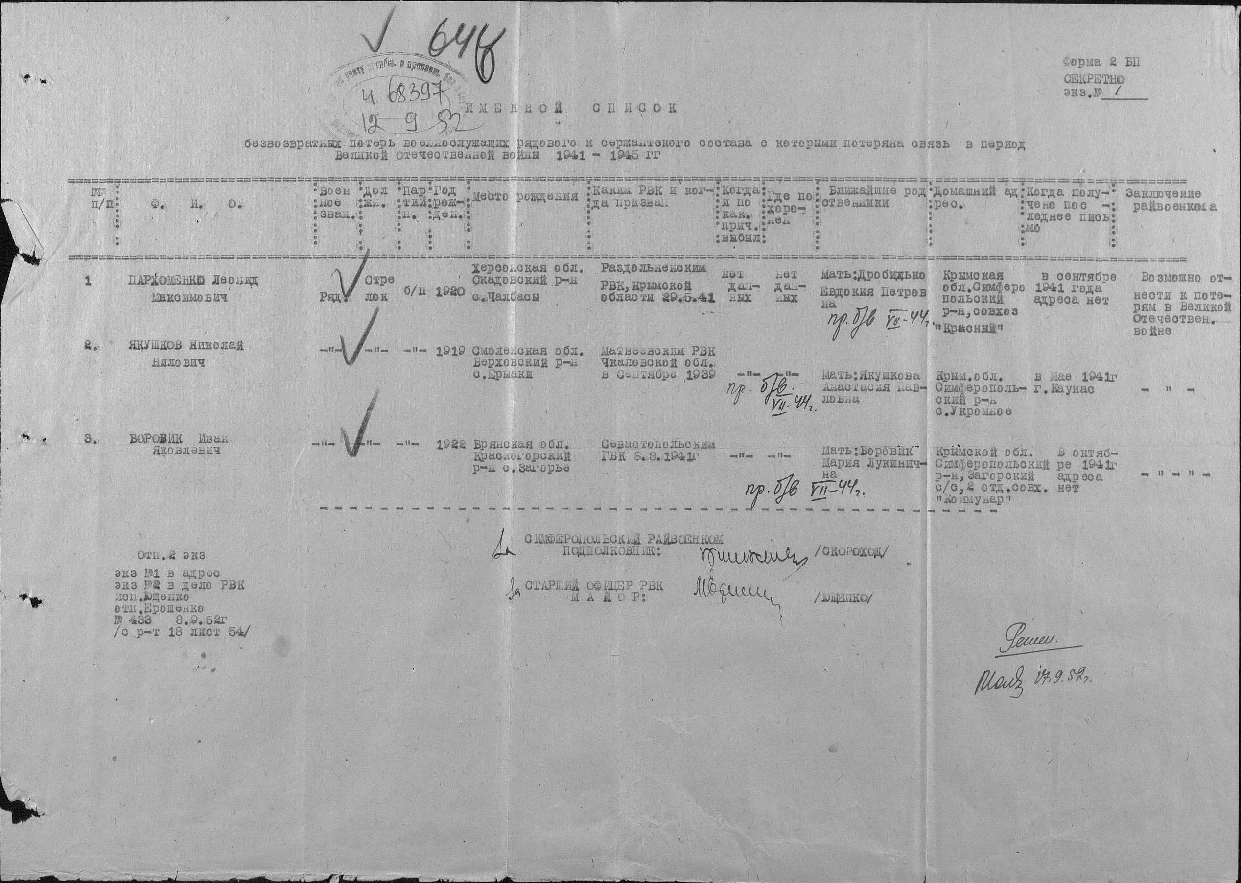 Учтён в 1952 г по материалу Симферопольского РВК Крымской области, так как сведения о его судьбе из воинской части не поступали.