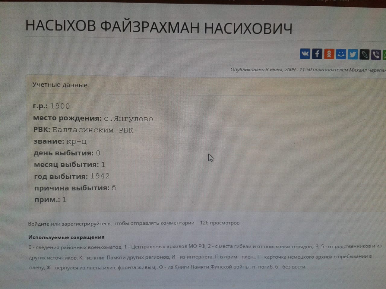| Родился 1900 г. с.Янгулово (респ Татарстан, Балтасинский район) жена Насихова Мукар призван Балтасинский РВК 1941 г.красноармеец. Односельчанин Исмагилов Ибрагим Исмагилович(который вернулся)1902 года, вместе призывались. По его словам попали в плен, где дед умер от голода. По архивам Ибрагим был в лагере Ламсдров 318 |