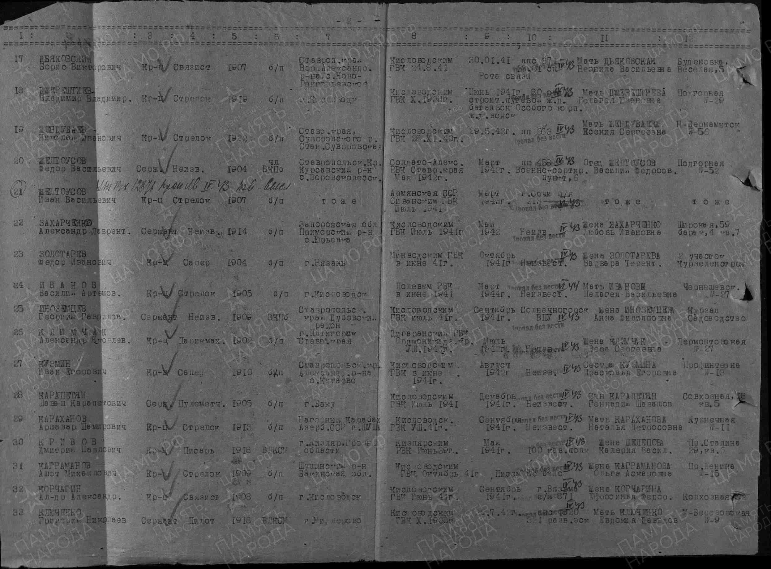 Добрый день, прошу помочь в нахождении моего прадеда 1905 года рождения. Есть только информация что пропал без вести __.04.1943. Призывался .07.1941 Кисловодский ГВК, Ставропольский край, г. Кисловодск, сержант пулеметчик.