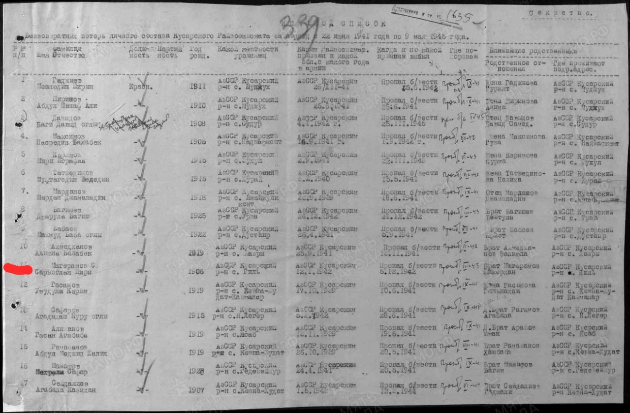 | Здравствуйте, пожалуйста, помогите в установлении судьбы или места гибели нашего дедушки Магерамова Сароглана Пири оглы, призывался из Азербайджанской ССР, село Гиль, 12.01.1942, погиб 05.12.1942 (со слов бабушки в последнем письме он сообщал, что они находятся почти в окружении, с одной стороны море, с другой - немцы). Другой информации и фотографии, к сожалению, нет. Мы потеряли связь с родственниками в Азербайджане. В приложенном файле информация о дедушке под пунктом 11, но имя написано с ошибкой. |