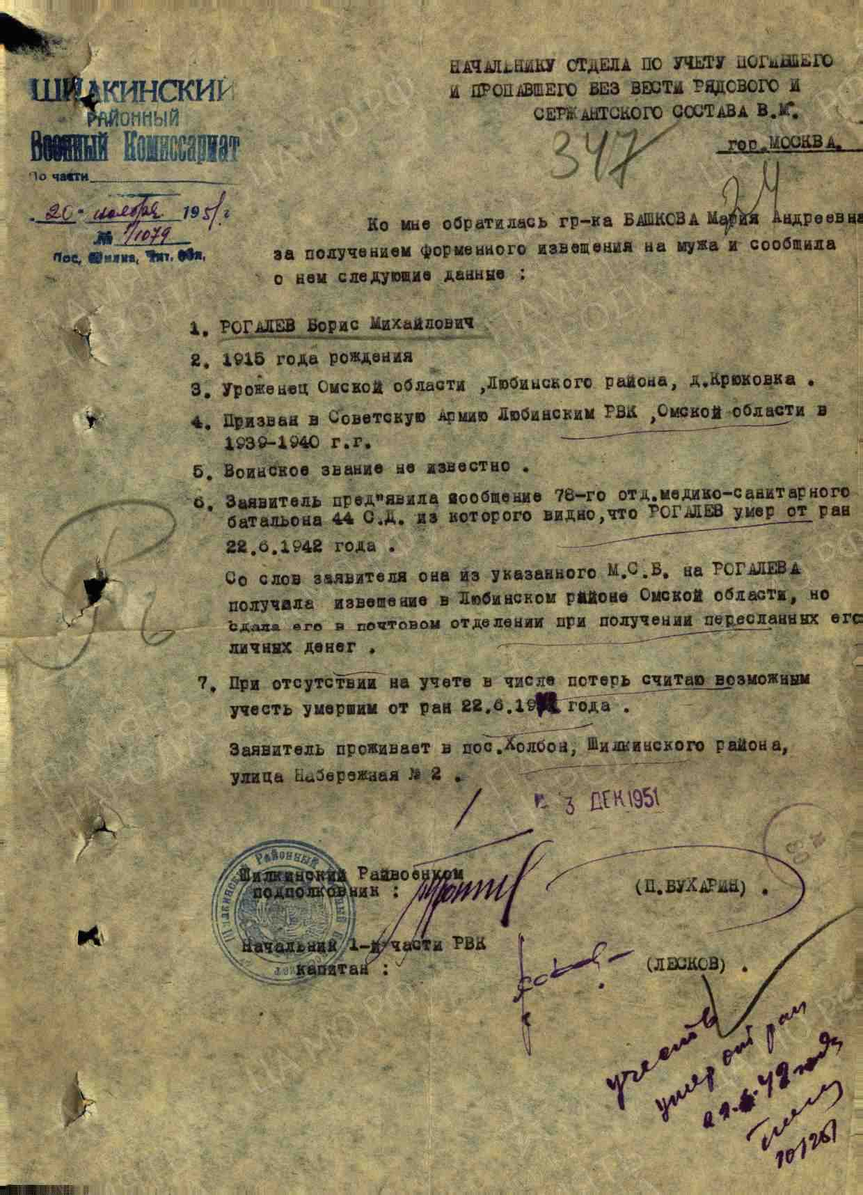 | Боевой путь моего родного дедушки Рогалева Бориса Михайловича, 1915 г, родилсяв Омской области, Любинского р-на, деревня Крюковка. Призван в Советскую Армию между 1939-1940 гг Любинским РВК, Омской области, Любинский р-на.Служил в 44 стрелковой дивизии, ранен в июне 1942 г и скончался от ран 22.06.1942 г в 78 медсанбате.На сегодняшний день имеется единственный документ, ответ на запрос моей бабушки Башковой Марии Андреевны от 20.11.1951 №1 /1079 |