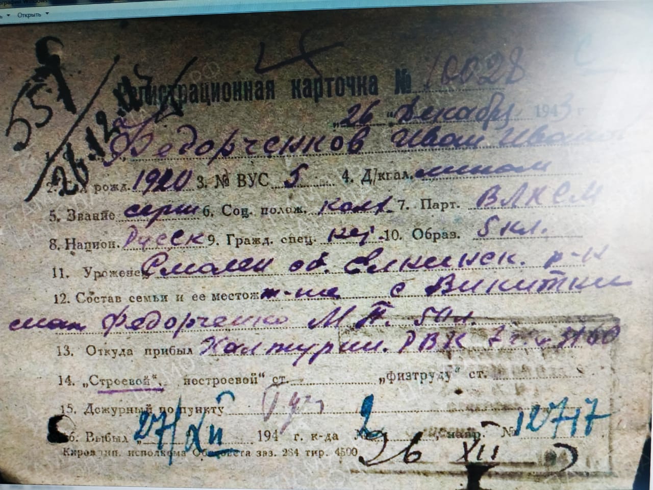 Федорченков Иван Иванович 1920 г.р., родился в Смоленской области, Ельненский район, село Вититни (Викитки). В.Ч. 10028 отд.ипт.д-н., прибыл Кировский ВПП воинская часть Халтуринский РВК (ЭГ 3460 или 3160). Выбыл из в.ч. 27.12.1943 г. команда №12717. |