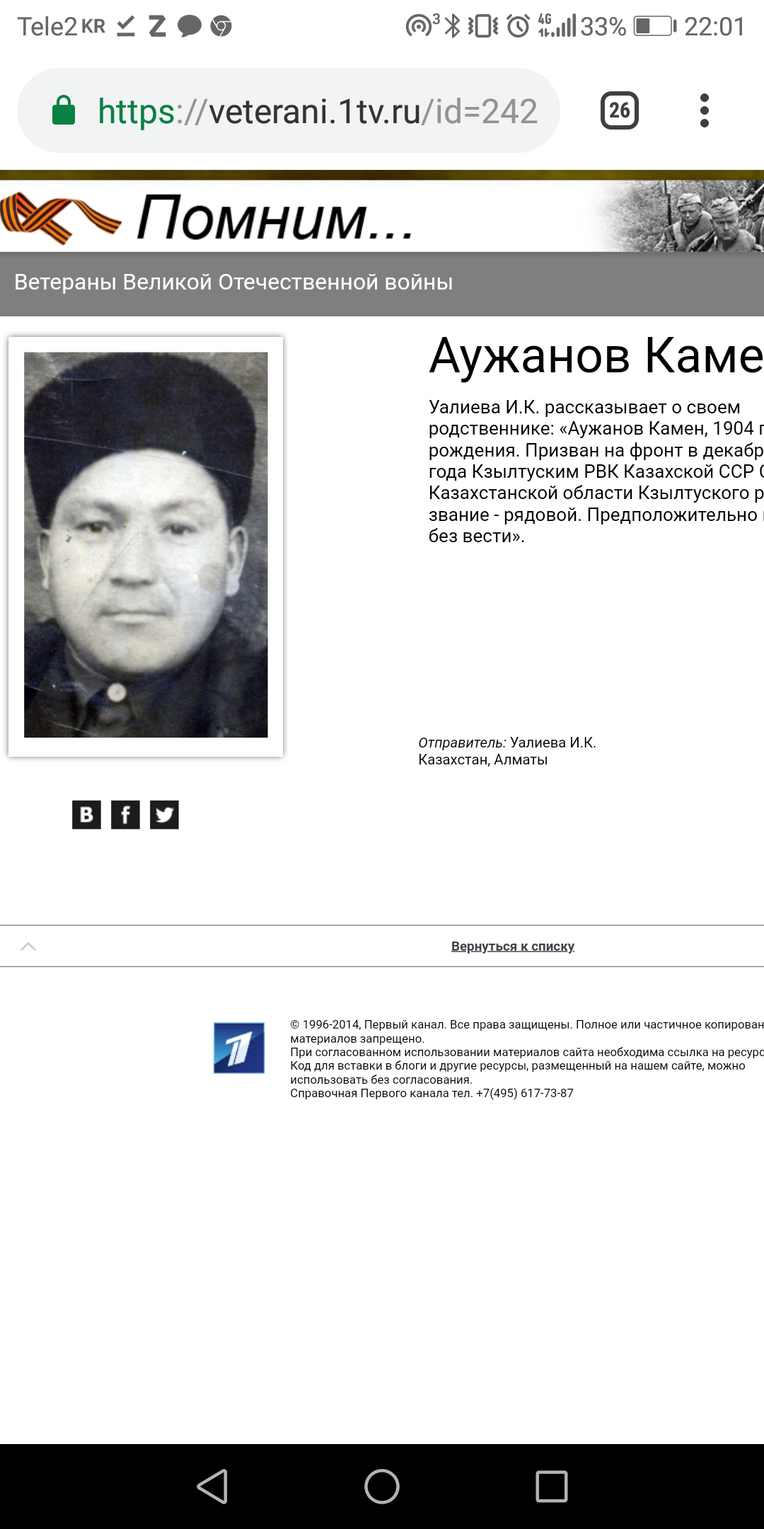 Второй дед-Аужанов Камен, так же призван с Кзылту, Казахстан. Пропал без вести |
