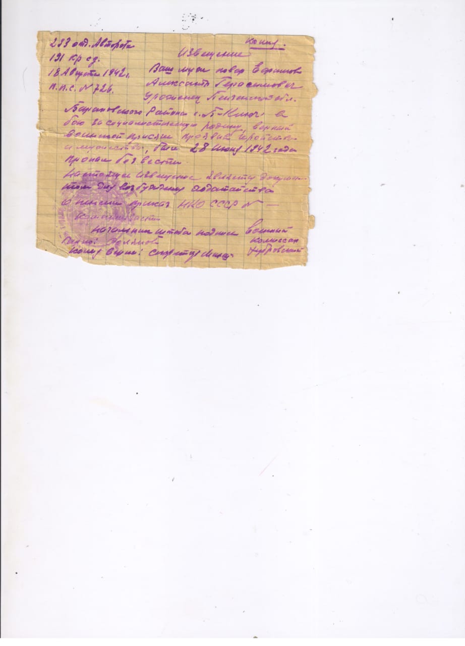 | Помогите найти прадеда Ефимова Александра Герасимовича. Родился в 1914 уроженец Пензенской области, Барановского р-на. с. Белый Ключ. Повар 293 отдельной автороты 191 стрелковой дивизии пропал без вести 28 июня 1942. 28.06.1942 191 сд находилась между деревнями Спасская Полисть и Селищи.