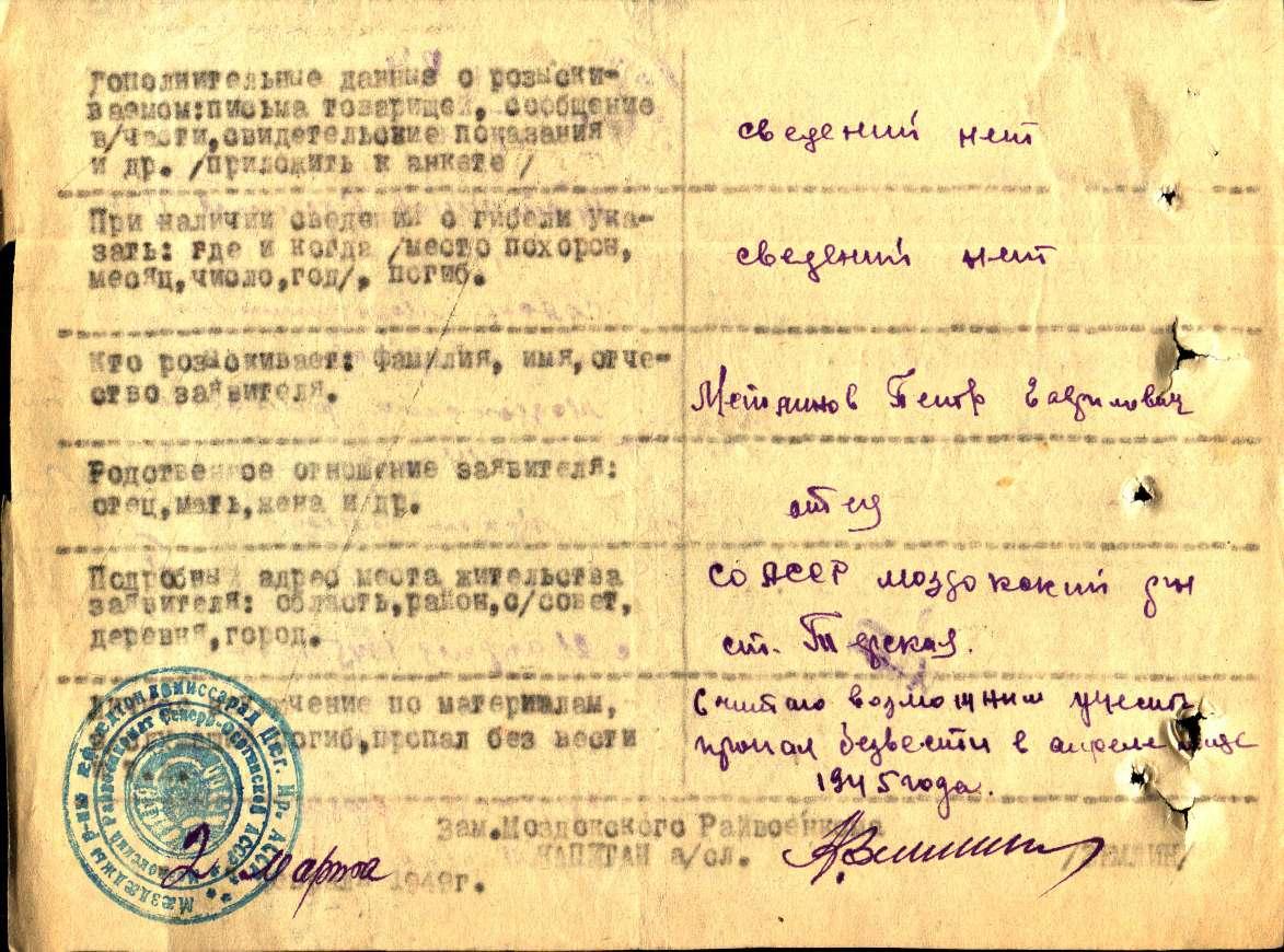 Пропал без вести Метлинова Сергей Петрович 1926г.р.