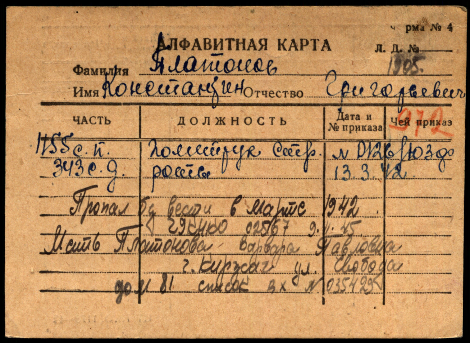 | Добрый день! Ищу дедушку моего супруга. Платонов Константин Григорьевич 1905г.р. по извещению от 13 апреля 1946г. он, старший сержант, погиб 17 августа 1942г. и похоронен в Харьковской области. По документам, найденным на сайте ОБД Мемориал, он, или политрук, или сержант, или без звания, пропал без вести в марте 1942 года. Но везде одна и та же информация о месте рождения - Владимирская область, г.Киржач, и о номере воинского формирования - 1155 стрелковый полк 343 стрелковой дивизии. Подскажите, пожалуйста, как возможно уточнить информацию о судьбе нашего дедушки?