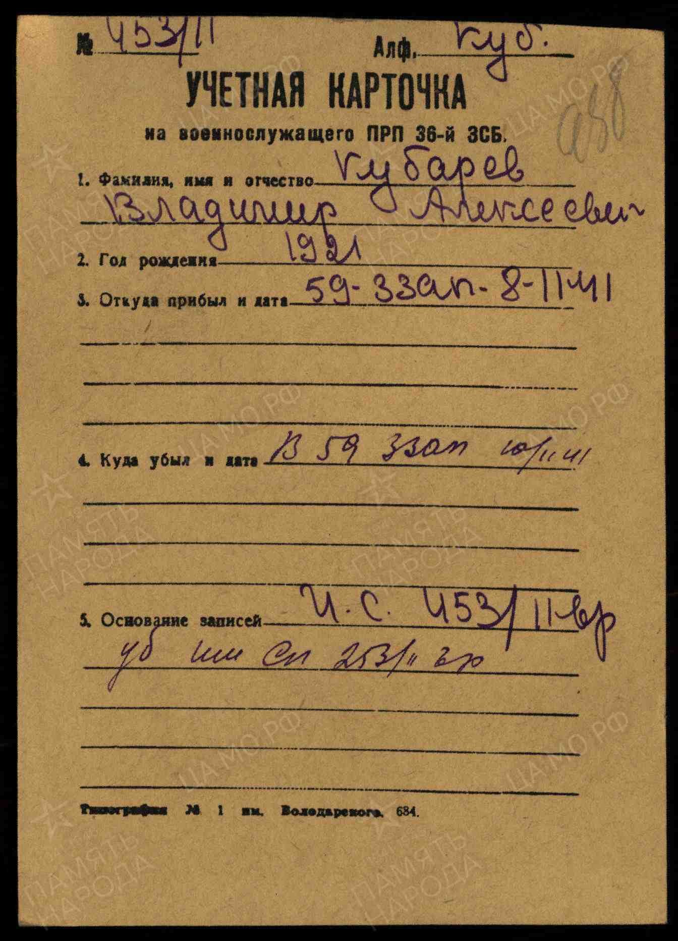 помогите найти моего дядю Кубарева Владимира Алексеевича 1921 года рождения военно пересыльный пункт ПРБ 36 ЗСД прибыл 08.11.1941 года |
