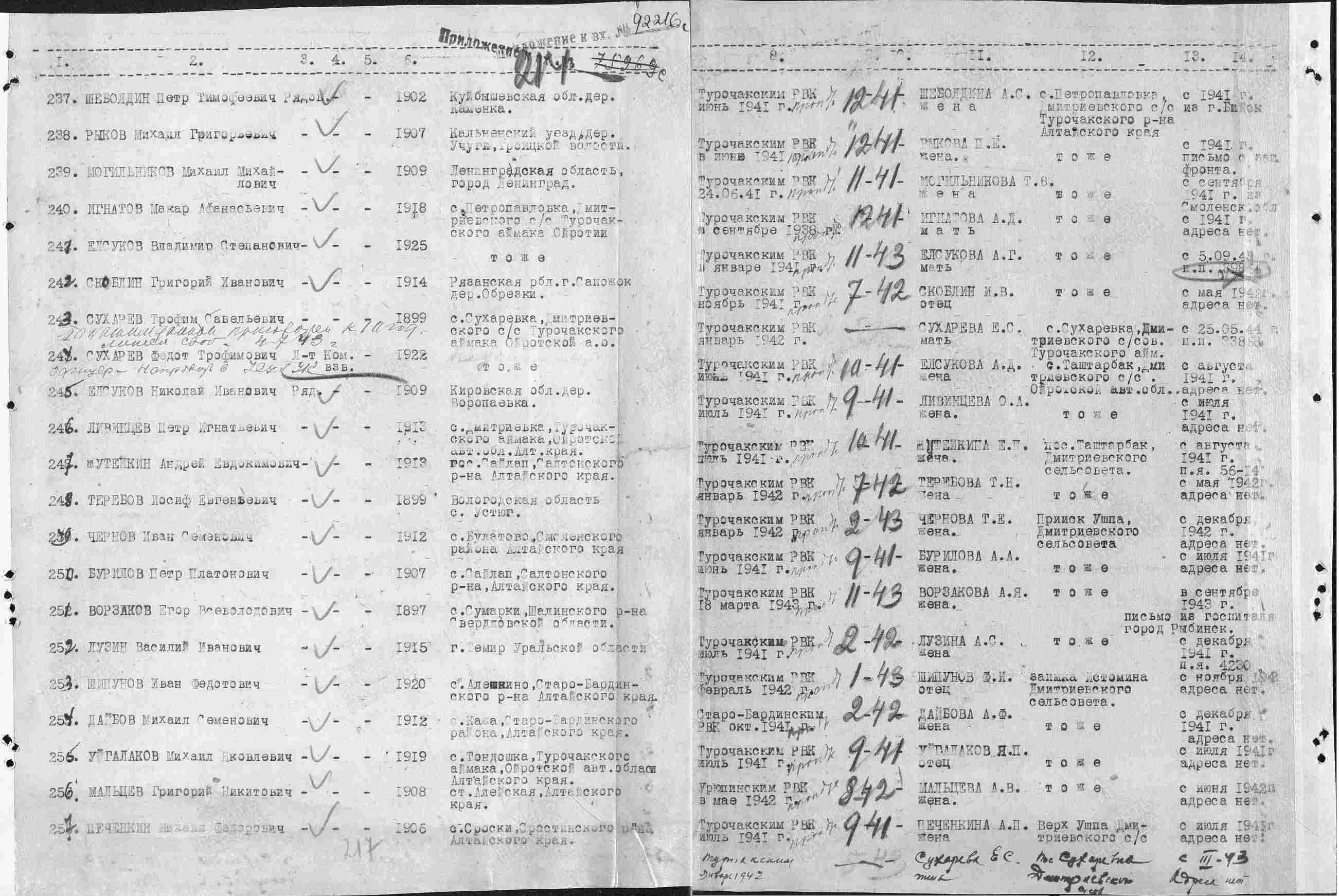 Дата и место призыва: __.02.1942 Турочакский РВК, Алтайский край, Ойротская АО, Турочакский р-н