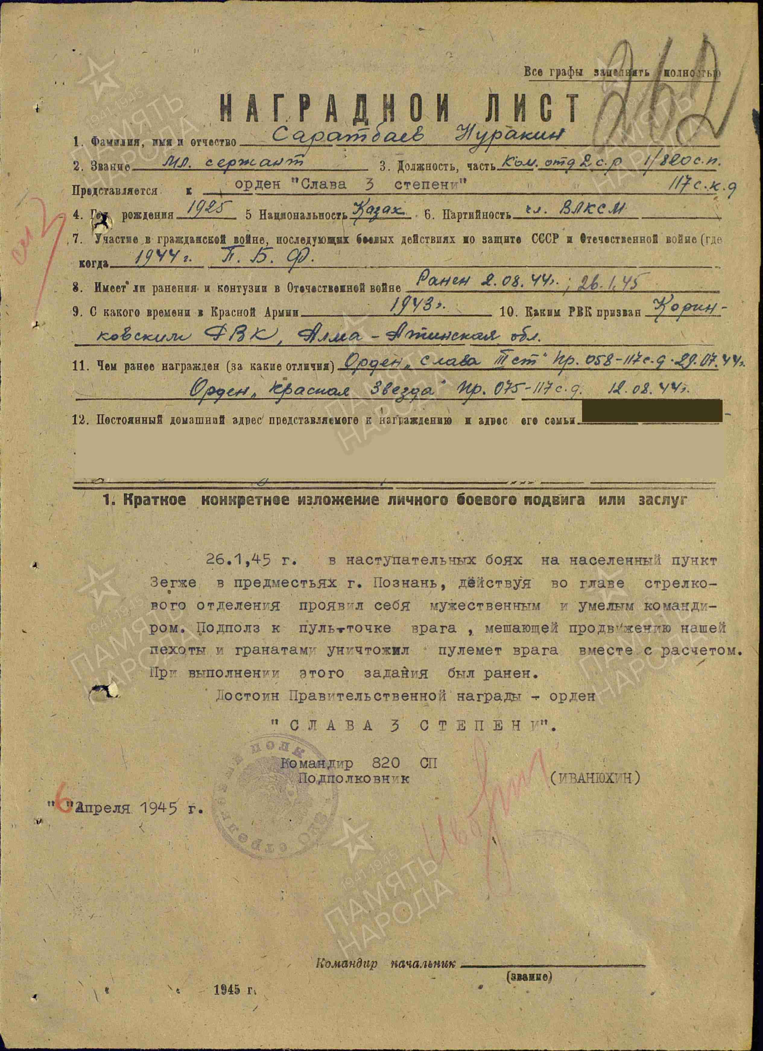 | Доброе время суток. Ищу любую информацию про деда, Саретбаев Нуракин 1925 г., звания: мл сержант. на сайте память народа есть некоторые данные, но все они искаженные по ФИО. Получил орден 1945 г в апреле. не вернулся, нет данных о смерти. Пожалуйста помогите |