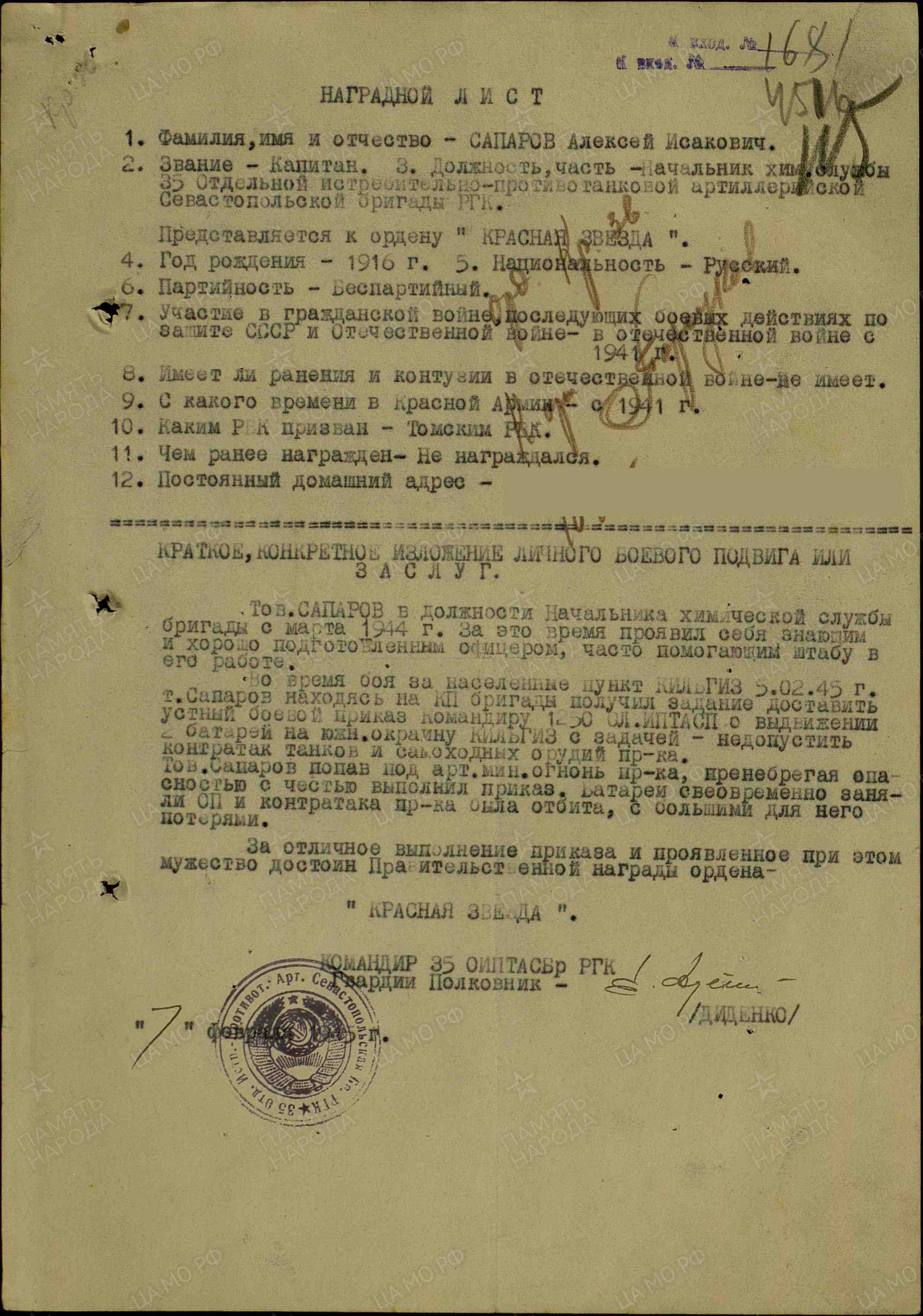 | Здравствуйте!из интернет ресурсов узнала, что мой дед Сапаров Алексей Исакович 1916 гр,место призыва: Томский РВК, Новосибирской обл, Томский р-н, время призыва 1941 г. капитан , начальник химической службы 35 отдельной истребительной противотанковой артиллерийской бригады РГК был удостоен награды орден Красной звезды. приказ № 24 от 12.04.1945 г. издан ВС 3 Бел.фронта. Архив ЦАМО. фонд 33. опись 686196. ед. хранения 6602. № записи 29840602.В наградном листе домашний адрес не указан.Дата представления к награде отсутствует. У деда этой награды не было и в семье про нее никто не знал. В вашем списке не врученных наград я его не нашла. Как мне можно узнать, вручалась ли эта награда моему деду или нет? |