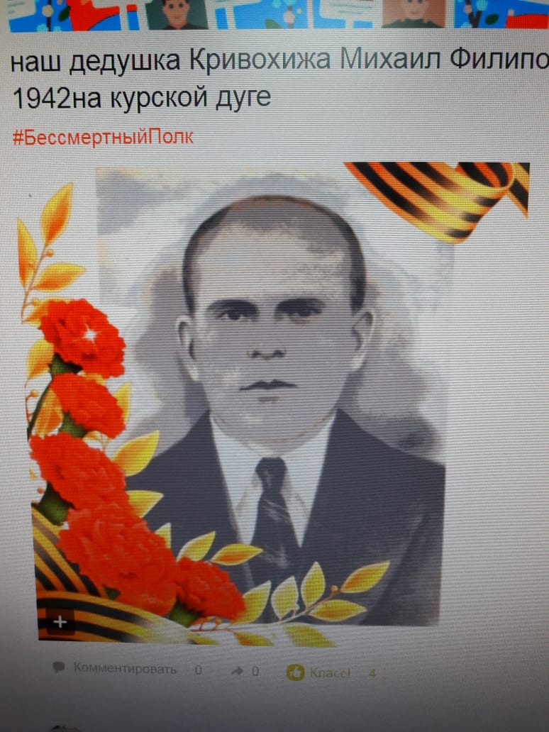 | Здравствуйте! Помогите, пожалуйста, найти прадедушку, пропавшего без вести на фронтах ВОВ, солдат, Кривохижа Михаил Филиппович. Известные данные: 1901 г.р., призван в 1941г., место призыва: Красноярский край, Канский район, село Верхний Амонаш. Место пмж совпадает с местом призыва. Последнее известия были в 1942г. с Курской дуги. |