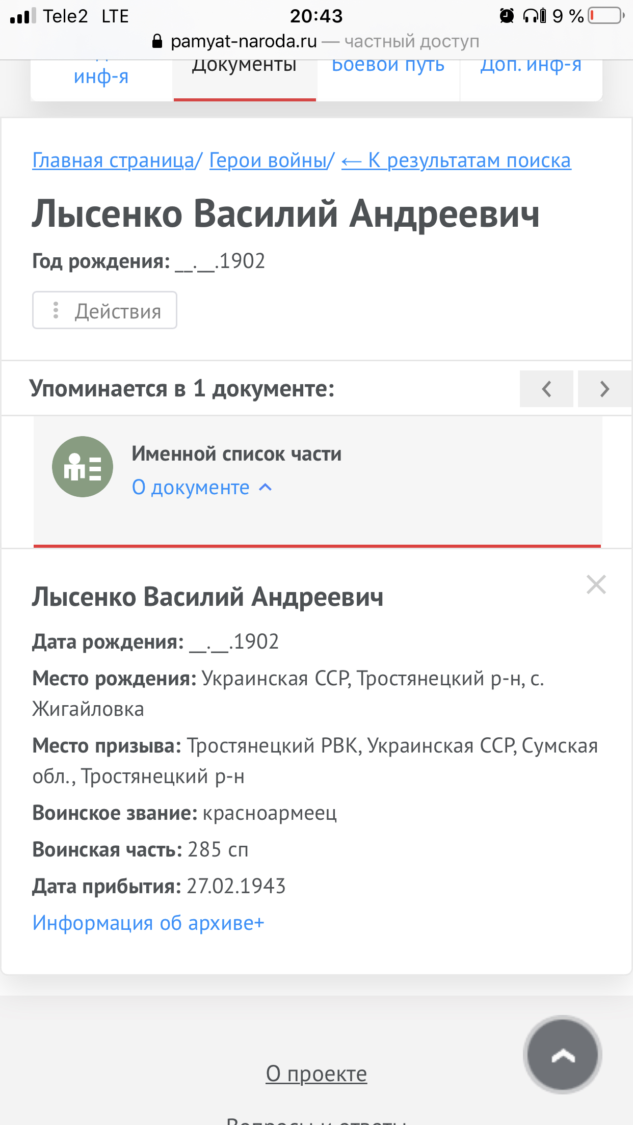 Мой прадед Лысенко Василий Андреевич 1902 г. был призван 1941г. больше нет никаких сведений .На портале Память народа есть 1документ о нем из ЦАМО .Помогите узнать что в этом документе, его нет ни списках погибших, ни пропавшим без вести.