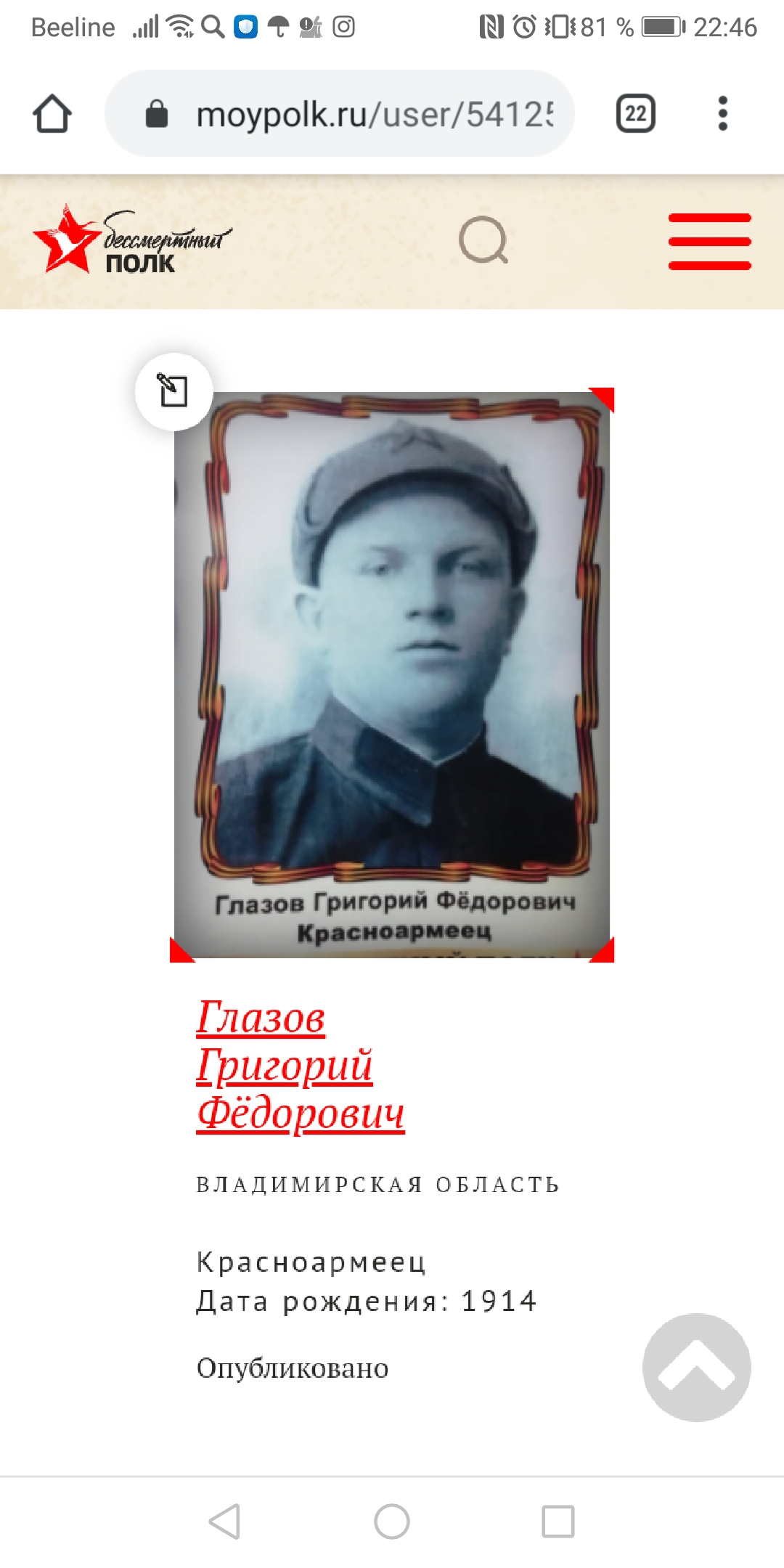| Прошу помочь найти информацию о продедушке Глазова Григория Фёдоровича. Год рождения 1914, родился Владимирская область, Вязниковский район, д.Каурково. 26.06.1941 был призван Вязниковским РВК. Последнее письмо 05.07.1941 г с г.Минск, что вступают в бой. Пропал без вести, жена:Глазова Лидия Ивановна. |