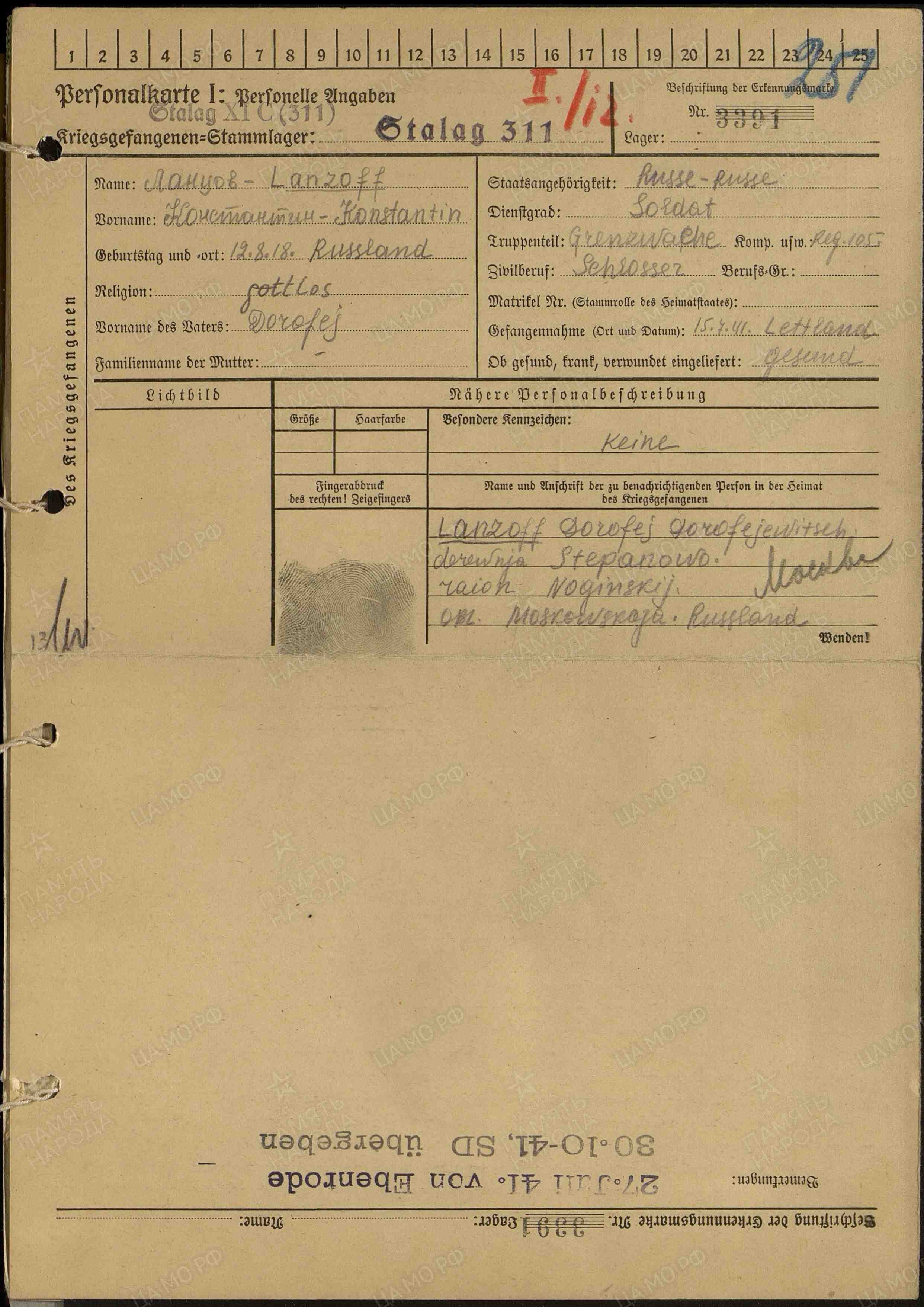 | Это мой дядя. Узнали, что 15.07.1941 года попал в плен в Латвии лагерь шталаг 311. Лагерный номер 3391. последнее место службы 105 пограничный полк.,рядовой. Хотим узнать дату смерти и место захоронения. Есть сведения, что дожил до освобождения, но не смог вернуться, та как болел, не ходил. Благодарны за любую информацию |