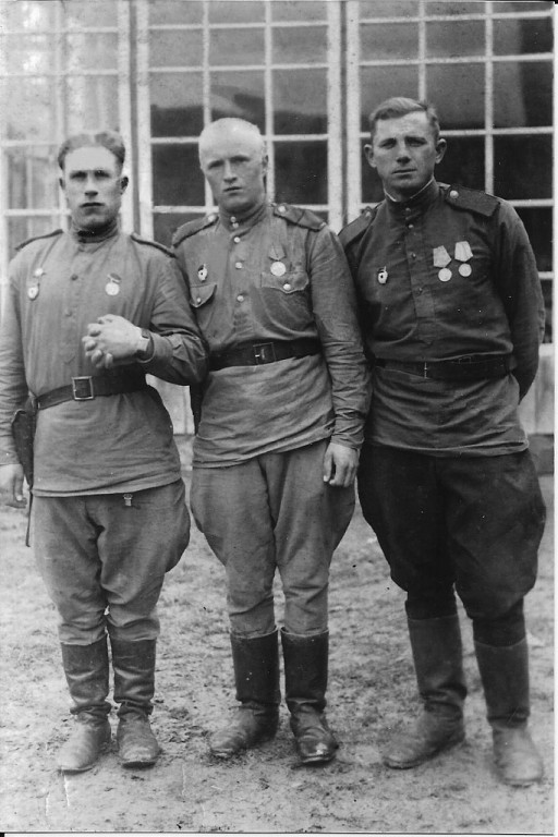 | На фотографии в середине мой отец Маслюк Ефим Гордеевич, 1918 г., гв.ст.сержант, призван Волчихинский РВК, Алтайский край, 1939 г., служил на Дальнем Востоке. Родился в с. Ащегуль, Ключевской р-н, Алтайский край.Был награжден медалью "За Отвагу" 28.11.1944 г. в г. Печ. место службы 52 отп. Фотография не подписана, слева и справа неизвестные военные герои. Может узнают их родственники. Есть ли такой сайт, где можно искать по фотографиям? |