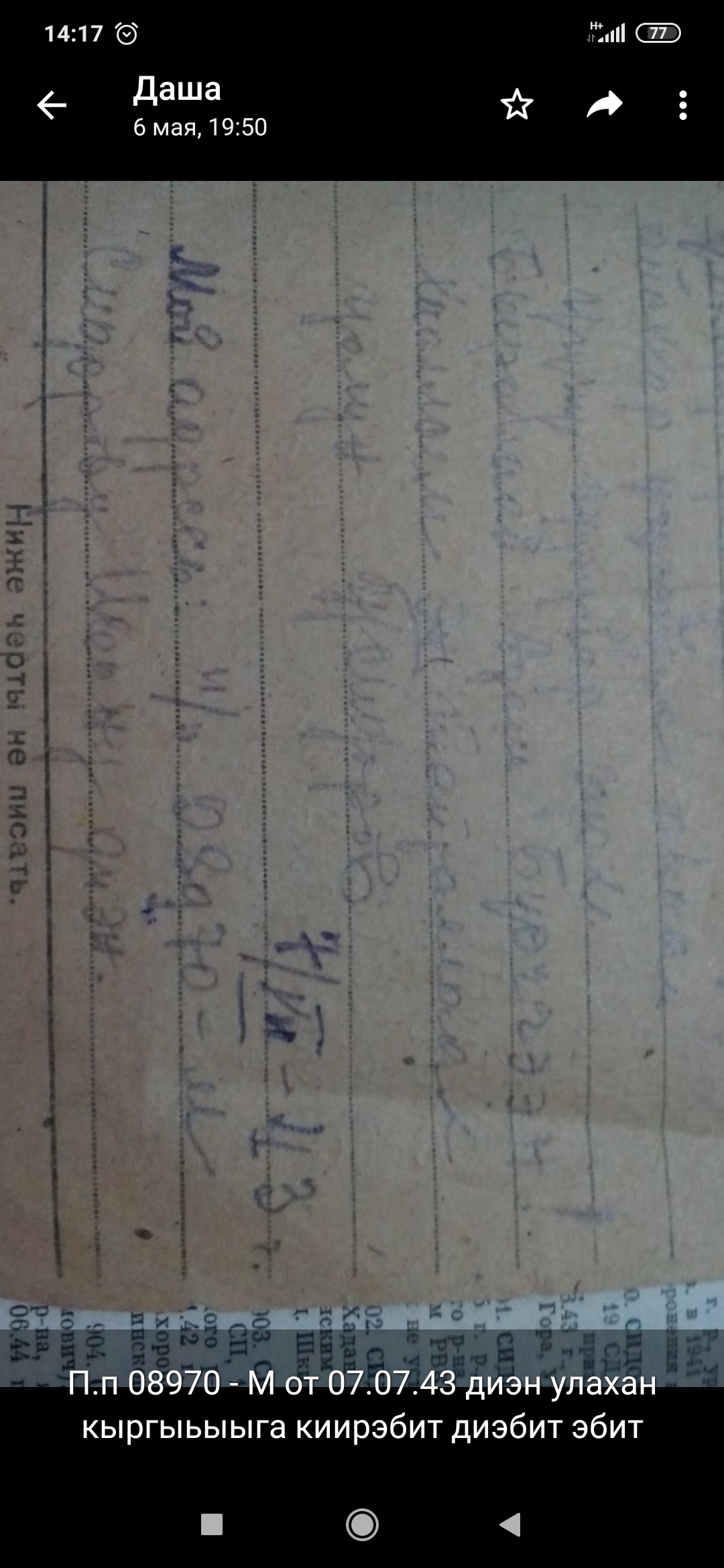 | Добрый день! Брат моего деда Сидоров Иван Петрович 1919 г.р. пропал без вести в 1943 году. Во всех официальных записях он пропал в марте 43-го года, но после этого приходили от него письма, что он жив, получил ранение. Перед боем написал письмо 7 июля 1943 г. После этого писем не было. Адрес откуда приходили письма- 2247 часть 62 и п.п. 08970-М. Хотели бы узнать к какой военной части или каким войскам принадлежал этот адрес. |