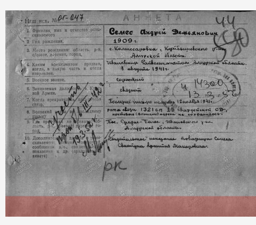 Семес Андрей Демьянович 1909 года рождения Был призван в августе 1941 в Ивановский РВК, Амурской области Последние место службы 1321 сп 15 гв. сд