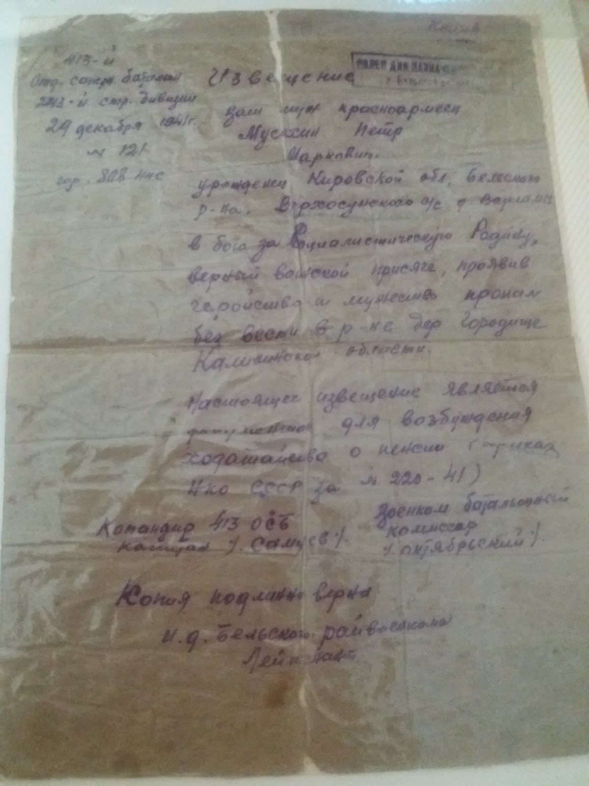 | Добрый вечер! Прошу Вашей помощи в поиске моего прадеда Мусихина Петра Маркрвича 1915г.р., уроженец Кировской области д.Варламы Верхосунского с/с. Призван Бельским РВК. Так как моей бабушке было 3 года , когда он пропал без вести на войне, а мать умерла еще в 1940, информации о нем знаем мало и родственников у нее не осталось, в донесении у него значится жена Ольга Ивановна, но таких родственников моя бабушка не знала, возможно он женился после смерти матери моей бабушки...Был сапером 413сапб 243сд, пропал без вести в д.Городище Калининской области 30.10.1941... В базах значится Луковниковский р-н , но 243 сд судя по донесениям и журналам, размещенным в базе Память народа, не находилась в этот период там, вероятнее всего на сайте Память народа ошиблись, указав Луковниковский район, и речь идет о ныне Старицком районе Тверской области ... Пыталась проанализировать в обд мемориал, искала на 30.10.1941 людей, пропавших без вести 243сд, выяснила, что пропали без вести в этот день очень много саперов,в т.ч. и командиры.... из них 2 человек потом были освобождены из плена в 1944, 2 погибли в 1942, хотя были указаны в том же лонесении как донесении пропавшие без вести в том же д.Городище Калининской обл... Однако в книге памяти указано, что он не пропал без вести, а захоронен в д.Городище и дата стоит декабрь 1941, но бои у д.Городище 243сд были именно 29-30 октября, а не декабря ... пробовала искать в базе военнопленных, не нашла о нем информации... Военкомат Кировской области сказали, что кроме извещения у них ничего нет. Неипредставляю, в каком направлении двигаться дальше. Братских могил в д.Городище я не нашла, но есть в соседней д.Каленицы. Очень хочется найти точную информацию, где и когда он погиб.... |