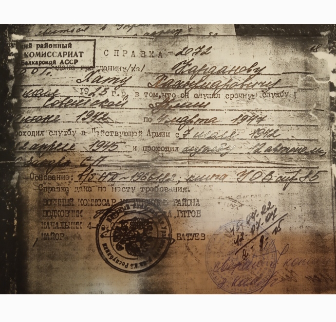 | Здравствуйте! Хотелось бы узнать о боевом пути моего деда Карданова Хату Хажумаровича 1923г.р. Родился в КБАССР Лескенский район, с. Старый Лескен. Призван Урванским РВК в 1942г. У отца имеется давний документ, ответ на его запрос в министерство обороны, но из-за того что это ксерокопия полностью разобрать текст невозможно. |