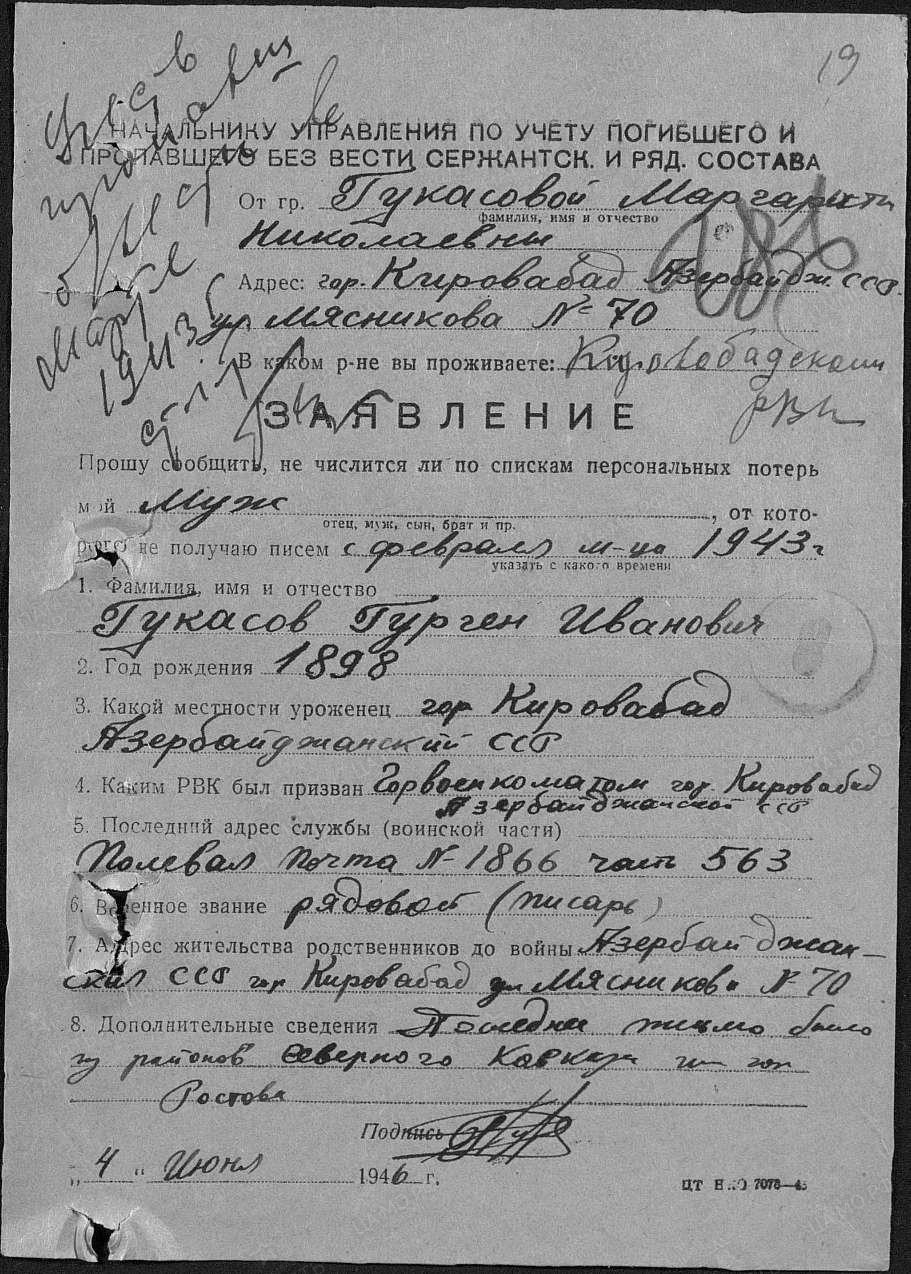 До войны проживал с семьей по адресу Кировобад Мясникова 70