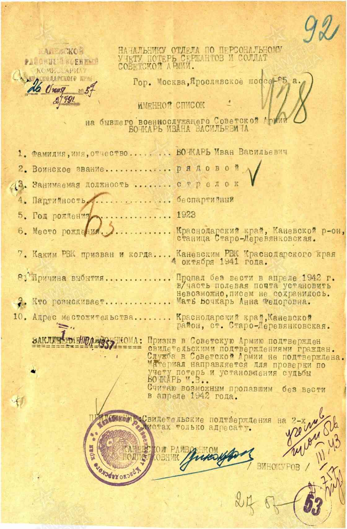 Дата пропажи без вести условная, поставлена по освобождению региона от оккупации. Связь прекратилась в апреле 1942 года. Писем семья не сохранила и обратного адреса нет. Начните поиск с военкомата призыва - уточните дату призыва, куда направлен и попросите список тех, кого призвали вместе с вашим бойцом. Я посмотрела призванных в октябре 1941 года 192* гг рождения, у многих к концу войны офицерские звания, возможно оканчивали курсы мл. офицеров. Найдите список призванных вместе с вашим, попробуем отследить судьбу других призывников