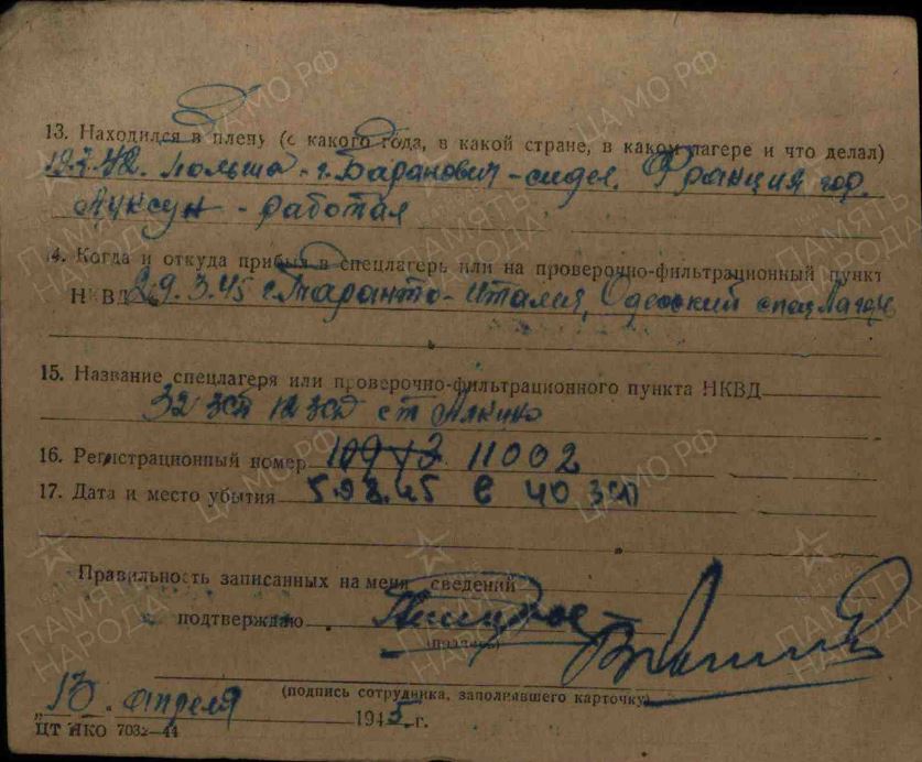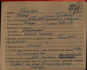 09.10.1906 года рождения. Жена Малика. Призван в 1943 году Туймазинским райвоенкоматом БАССР в 16-ую армию. В 1943 году попал в плен. Его этапировали из лагеря в лагерь. После освобождения его из плена советскими войсками, прошел сталинские лагеря. После вернулся домой в Туймазы к семье и умер в пожилом возрасте. Можно ли выяснить, был ли Гиниятов Гафур Гиниятович в немецком концлагере под Шауляем? Эта информация важна для поиска другого, пропавшего без вести в немецком концлагере, человека. |