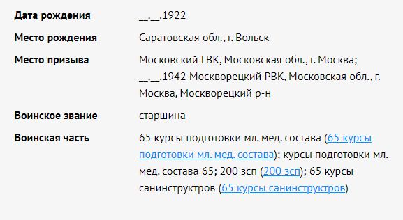 Нина Пальмова была медсестрой на фронте. Она родилась в 1922 или 1923 году. Жила в Москве.Это родная сестра моей матери.Она выносила бойцов с поля боя.Умерла она уже в мирное время.Где-то в 1970 году, по мужу её фамилия была Дуб. Она была очень красива, блондинка с голубыми глазами.Хотелось бы узнать какие-то подробности. |