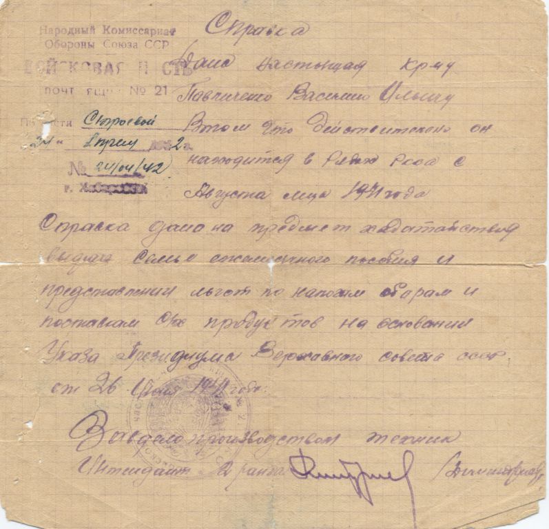 В справке от 24.04.1942 "В/ч п/я 21 г. Хабаровск".